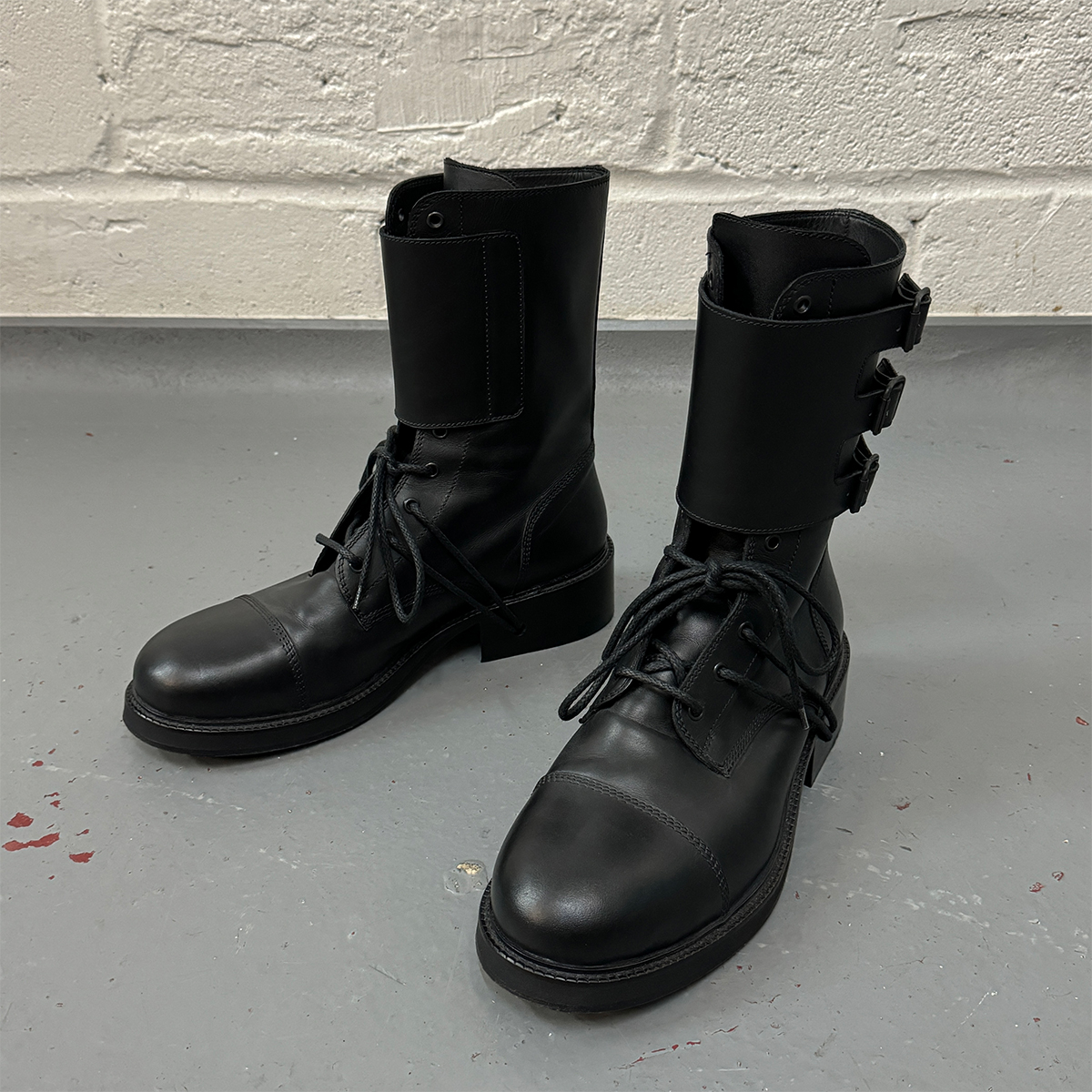 Featuring a lacing system which follows through the heel and back through the first four eyelets. Leaving the rest of eyelets empty where a belted strap, with three 3 belts, close around the ankle.