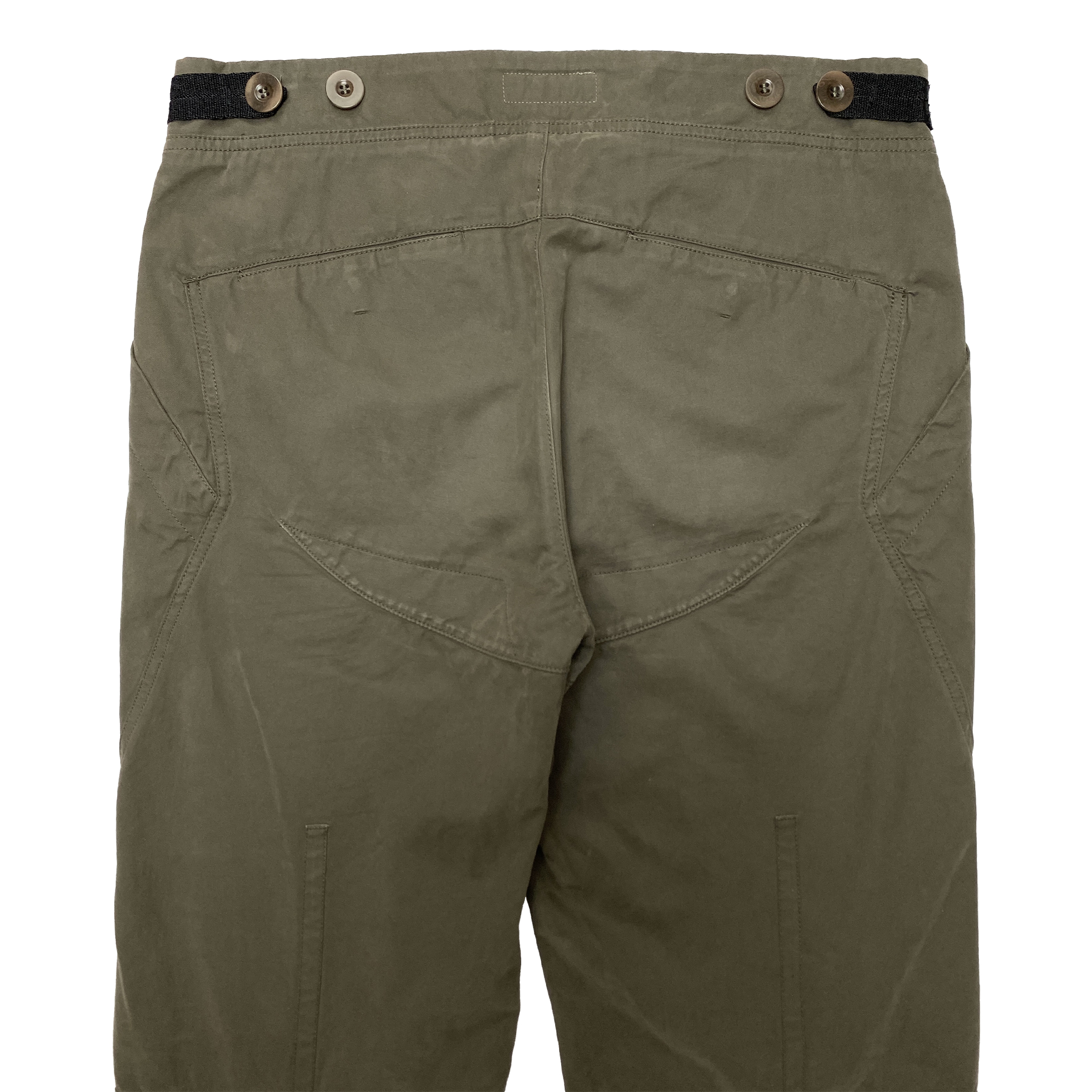Here we have a fantastic example of the great work produced under the Emporio Armani line in the early 2000s. Constructed out of a soft brushed khaki green cotton, these trousers feature a wide range of well-thought-through details. Such as panelling throughout the entirety, creating an anatomical cut, slash front and back pockets that run along the seams, button closure with adjustments on an invisible waist and buttoned cuff adjustments.