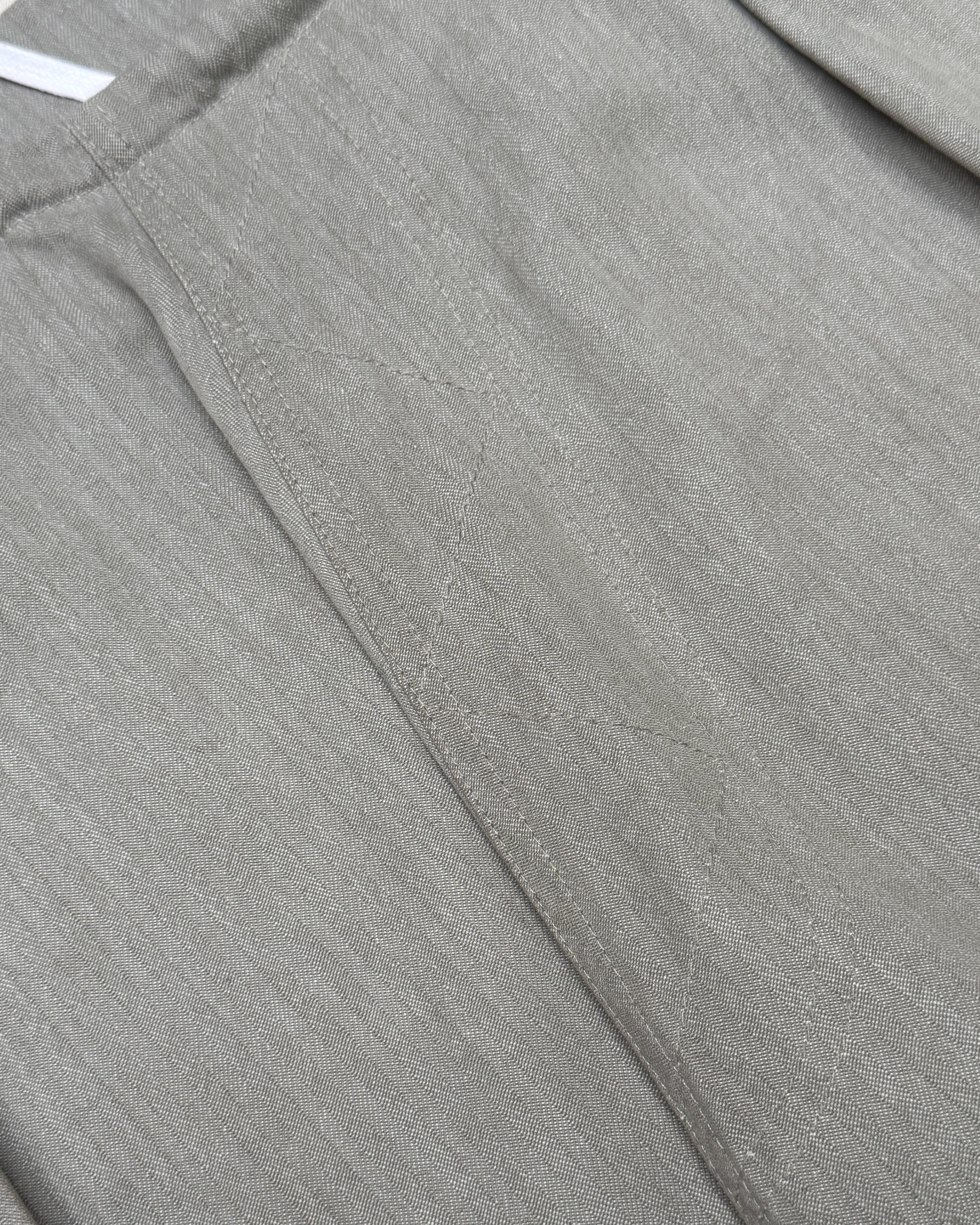 - Made from repurposed Italian military covers - 1980s silhouette - Two front pleats - Two side seam pockets - Drawstring waistband with waxed laces and metal aglet detailing - Trompe L’oeil button fly