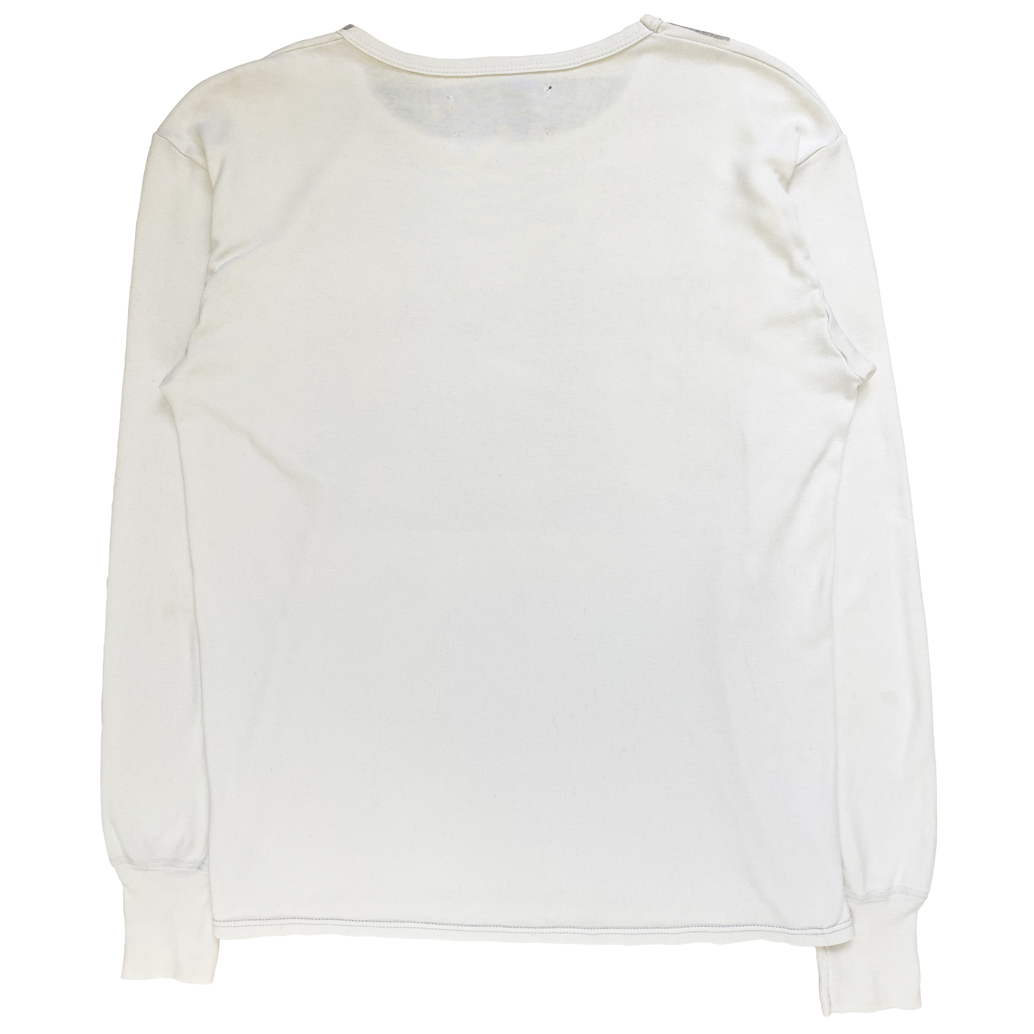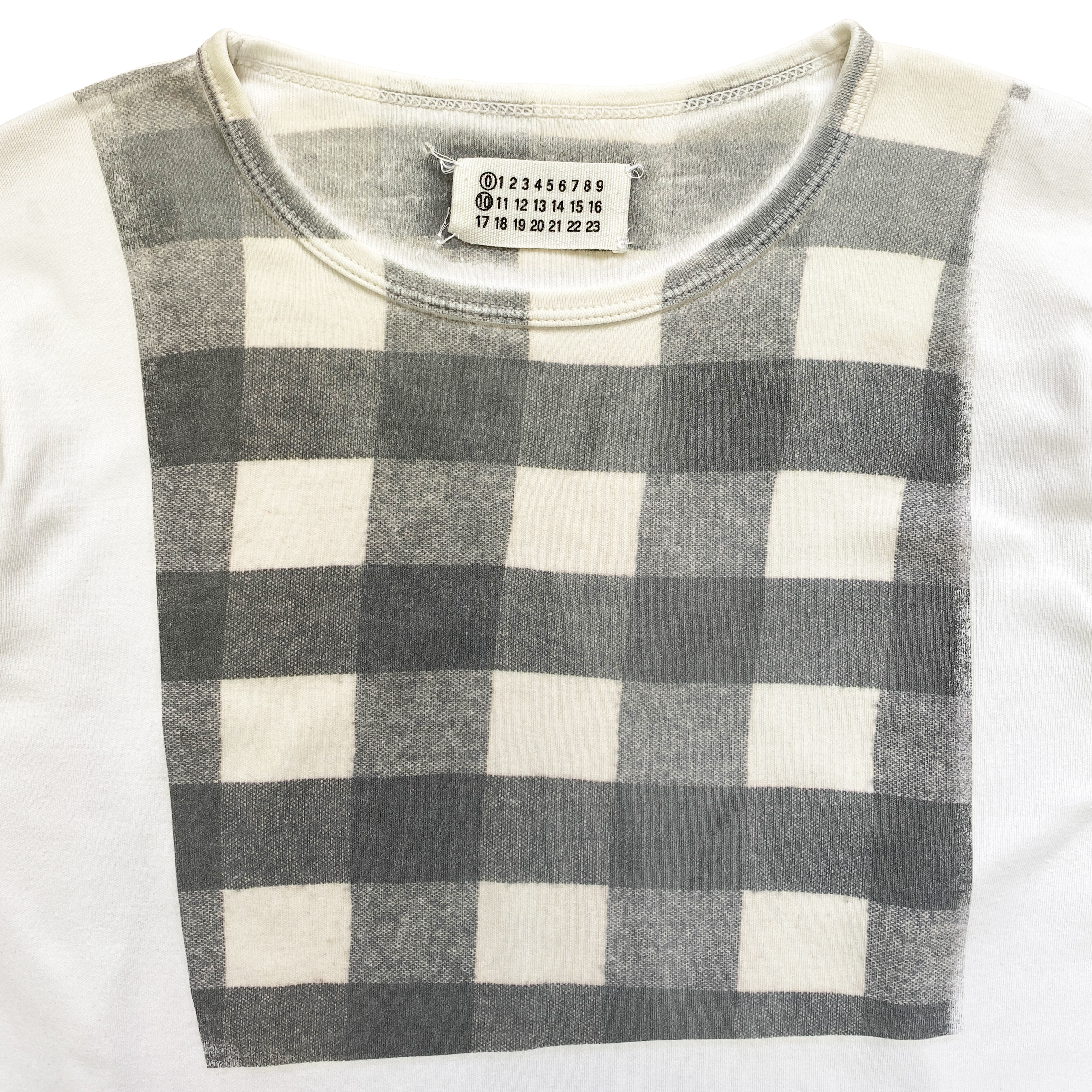 Here we see a fine example of the Trompe L’oeil technique adopted by the Maison, this long-sleeve is constructed in a soft, thick, vintage white cotton like all similar artisanal pieces for men. A slightly wide neck and cropped shape proves for an interesting fit when on body. Most notably a Trompe L’oeil checkered print has been hand printed on the garment after construction giving the effect of a scarf like apron. Seen styled in the A/W 01-02 look-book with a v-neck sweater whereby the print can be seen clearly.