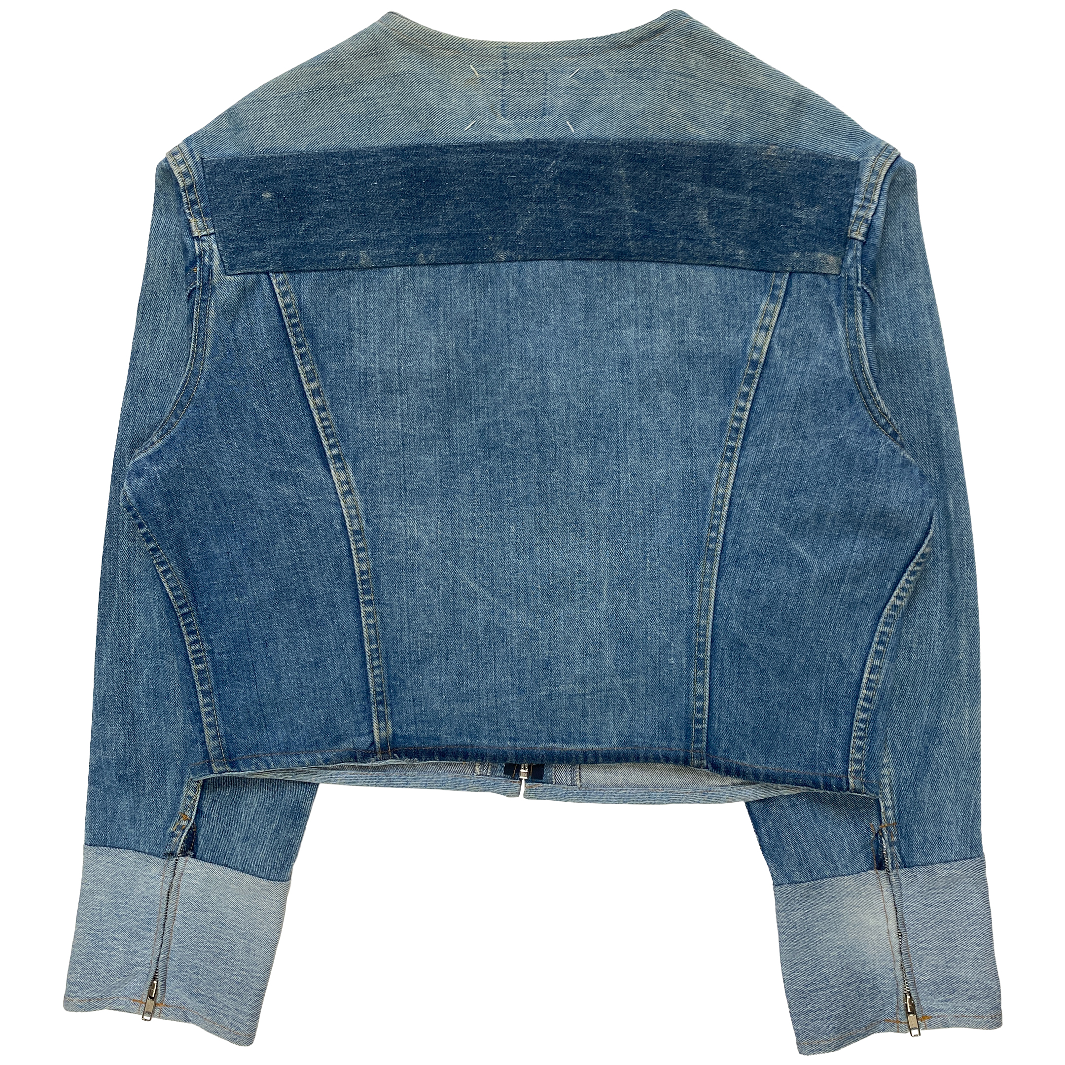 An incredibly intricate design using a selection of vintage denim jacket to rework them into a new cropped silhouette, using different washes and fabric weight throughout. Details include a rounded neck, zipped closure, extended sleeve and zipped cuffs.