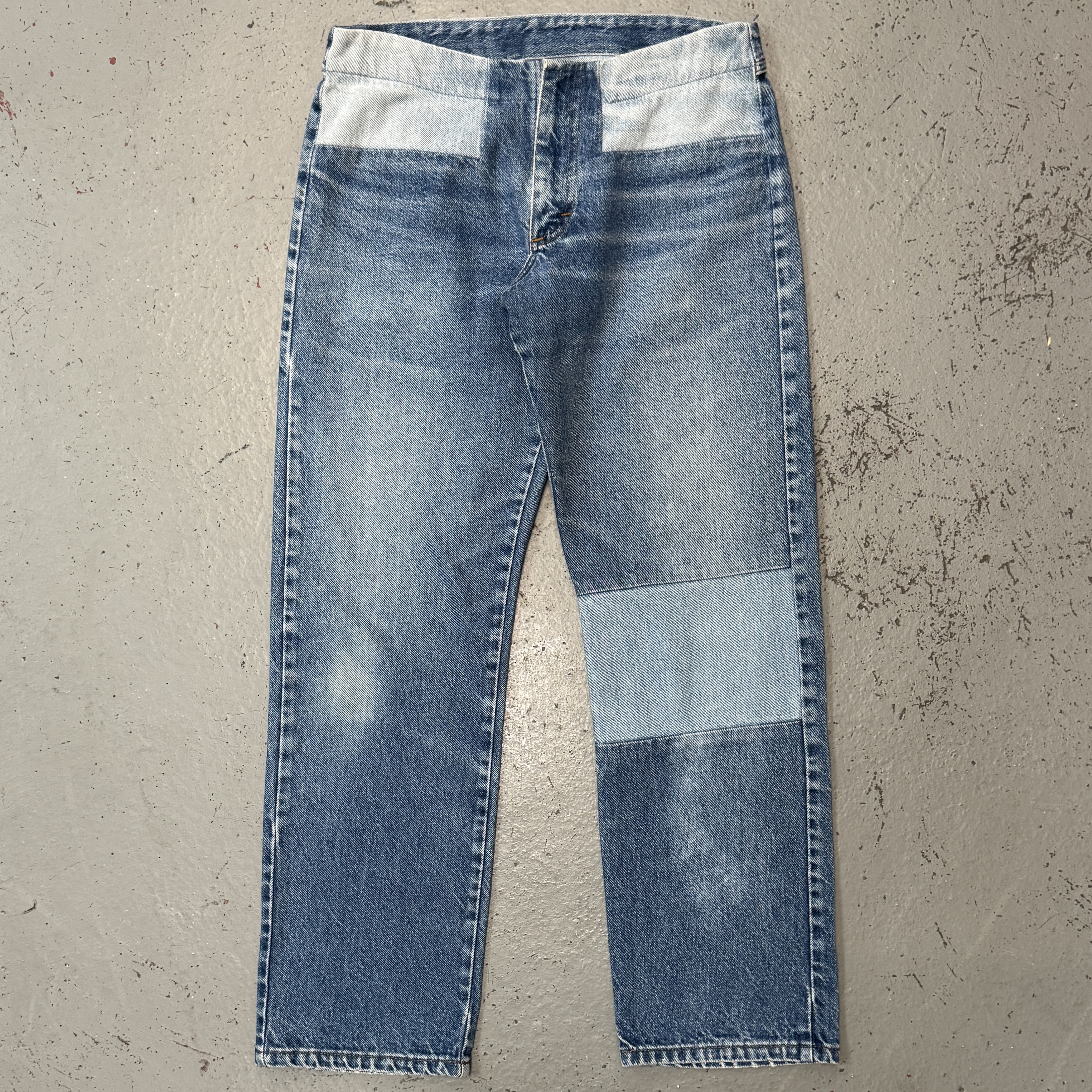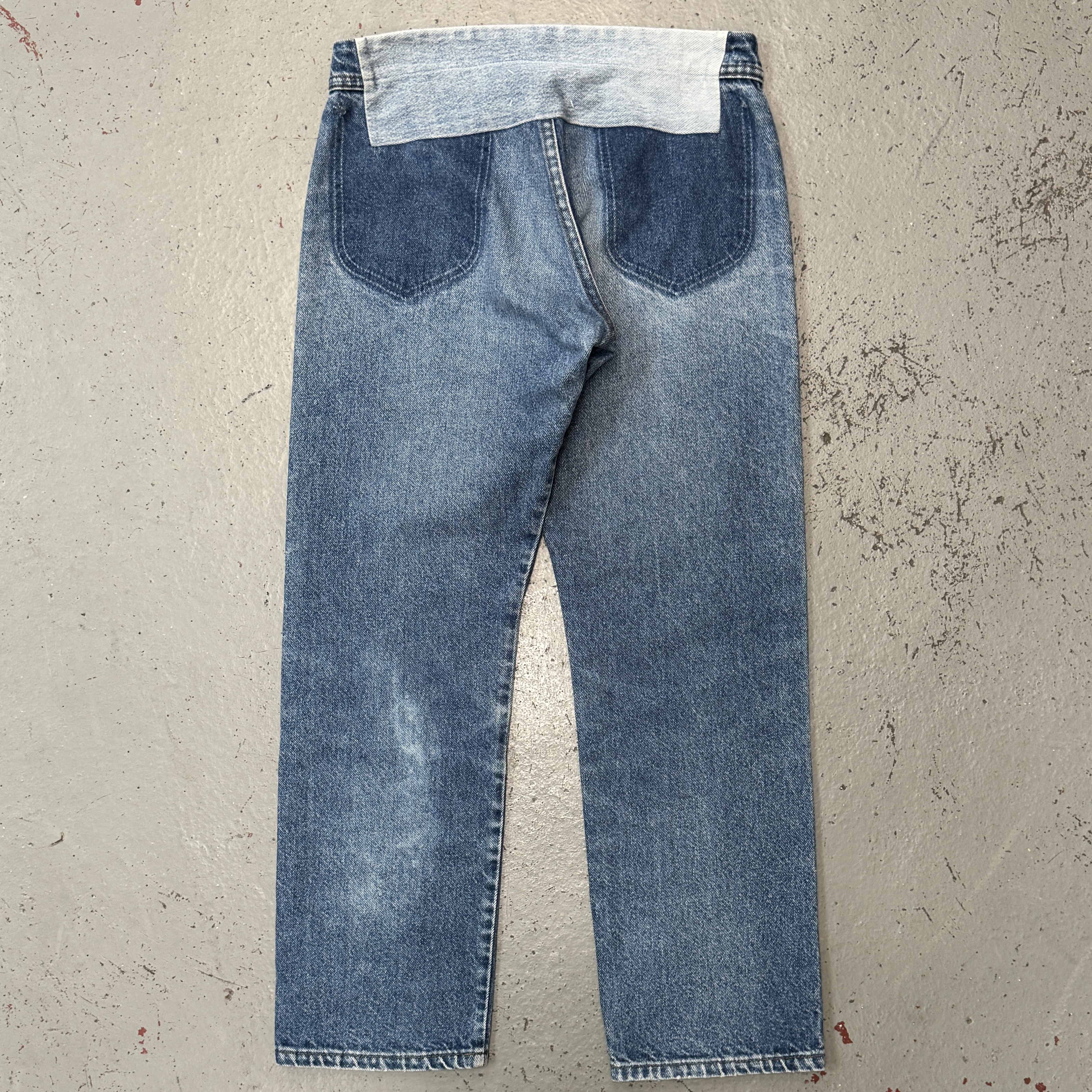 Here we have a fine example from the early women's artisanal work, using a collection of vintage sourced grey denim. Re-working them into a pair which includes constrasting patches on the knee, back centre and cleverly placed “pockets” which uses the Trompe Loeil effect.